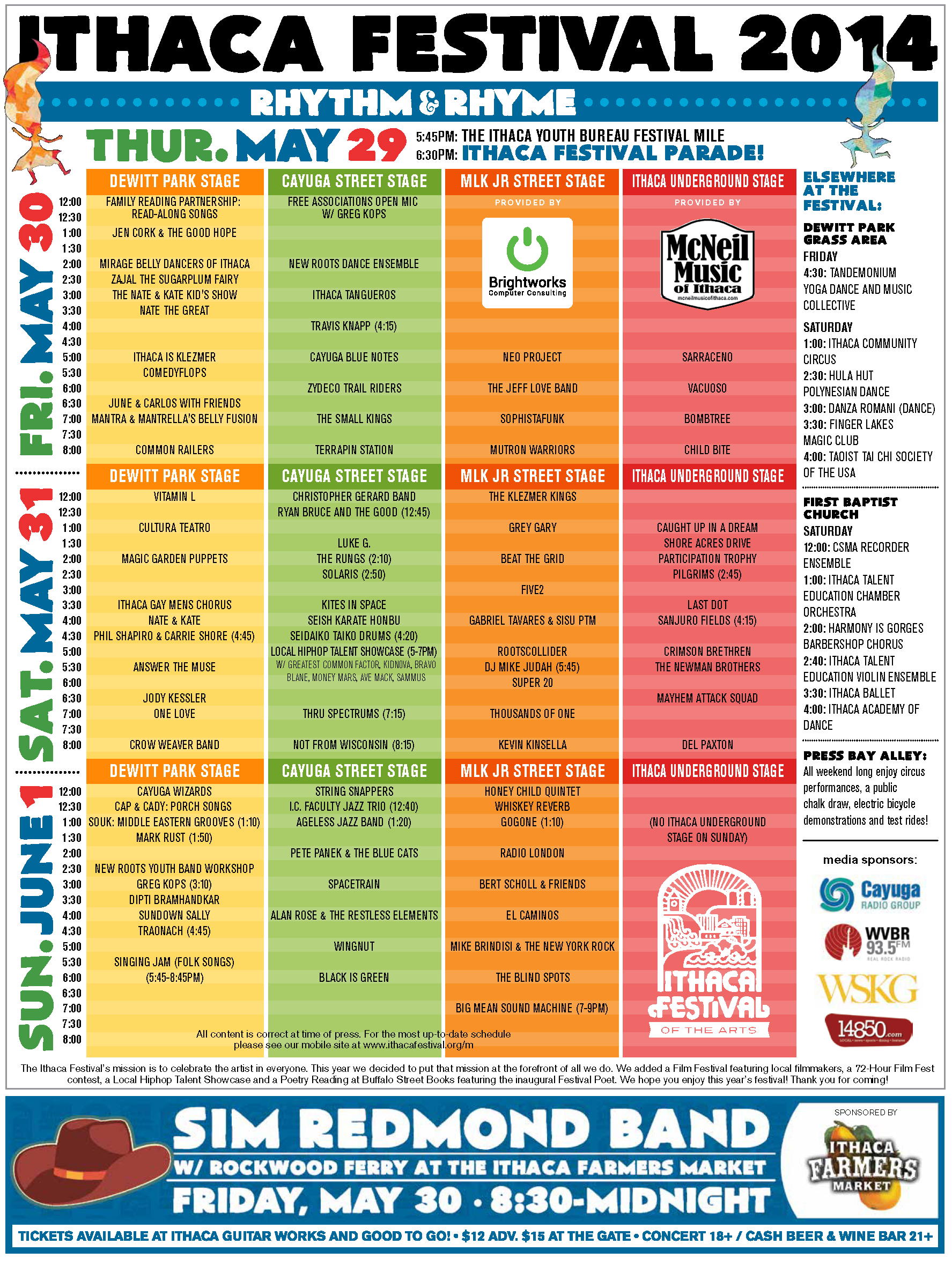 What do the residents of Ithaca NY do after the Cornell students leave? Celebrate!! With an annual weekend festival featuring a lively parade, lots of live music, dance, delicious food, craft vendors, and summer craziness. Our set is Saturday May 31st 2:10pm at the Cayuga St Stage. Lots of other great musicians on the schedule this year! Check it out:
